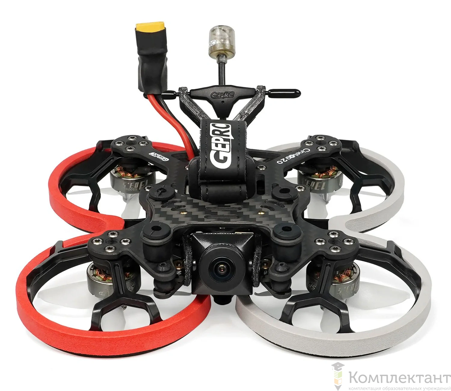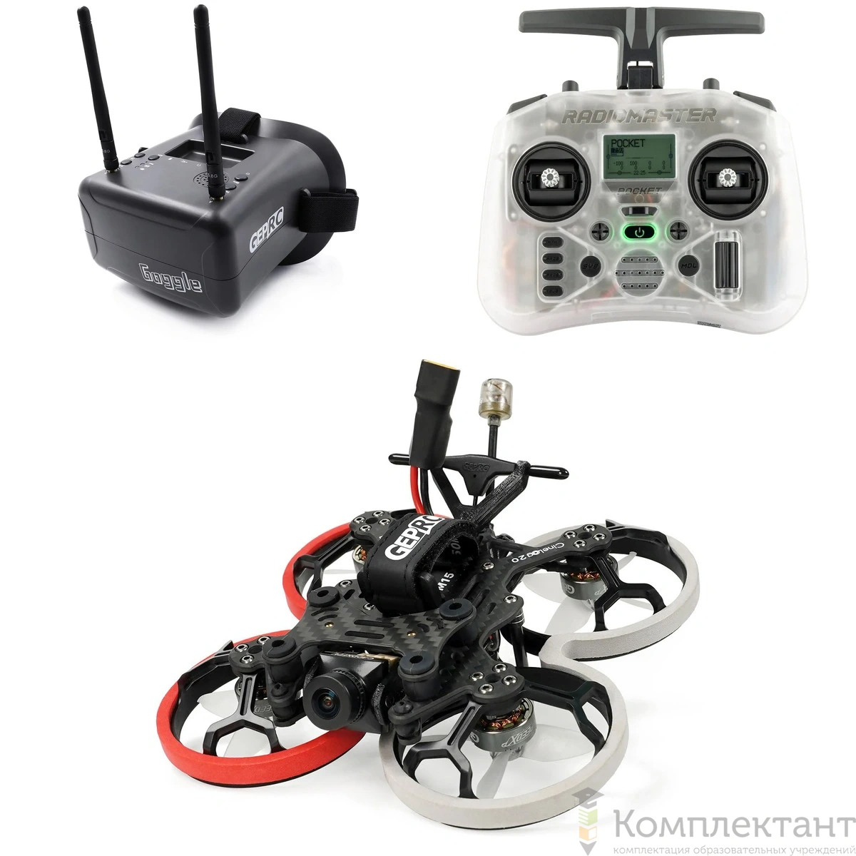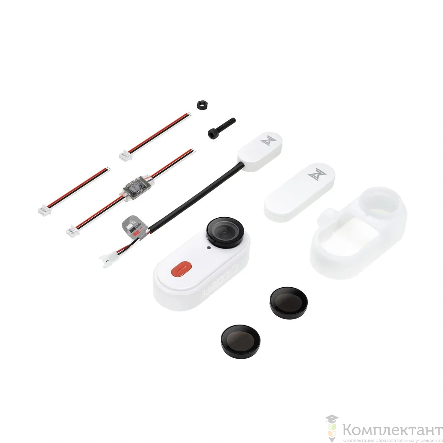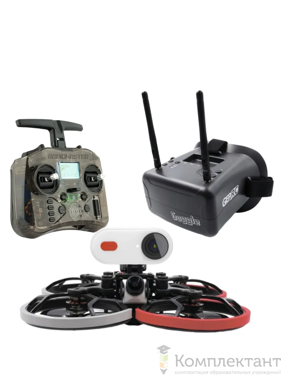 В основе комплекта — компактный квадрокоптер формата CineWhoop с защищённой рамой, что делает полёты безопасными и позволяет тренироваться даже в ограниченных пространствах. Квадрокоптер дополняется аппаратурой дистанционного управления, очками для полётов от первого лица, аккумуляторами с зарядным устройством и набором переходников. Важной частью является FPV-камера с записью в высоком разрешении и встроенной стабилизацией изображения, что открывает широкие возможности для творческих и учебных проектов.