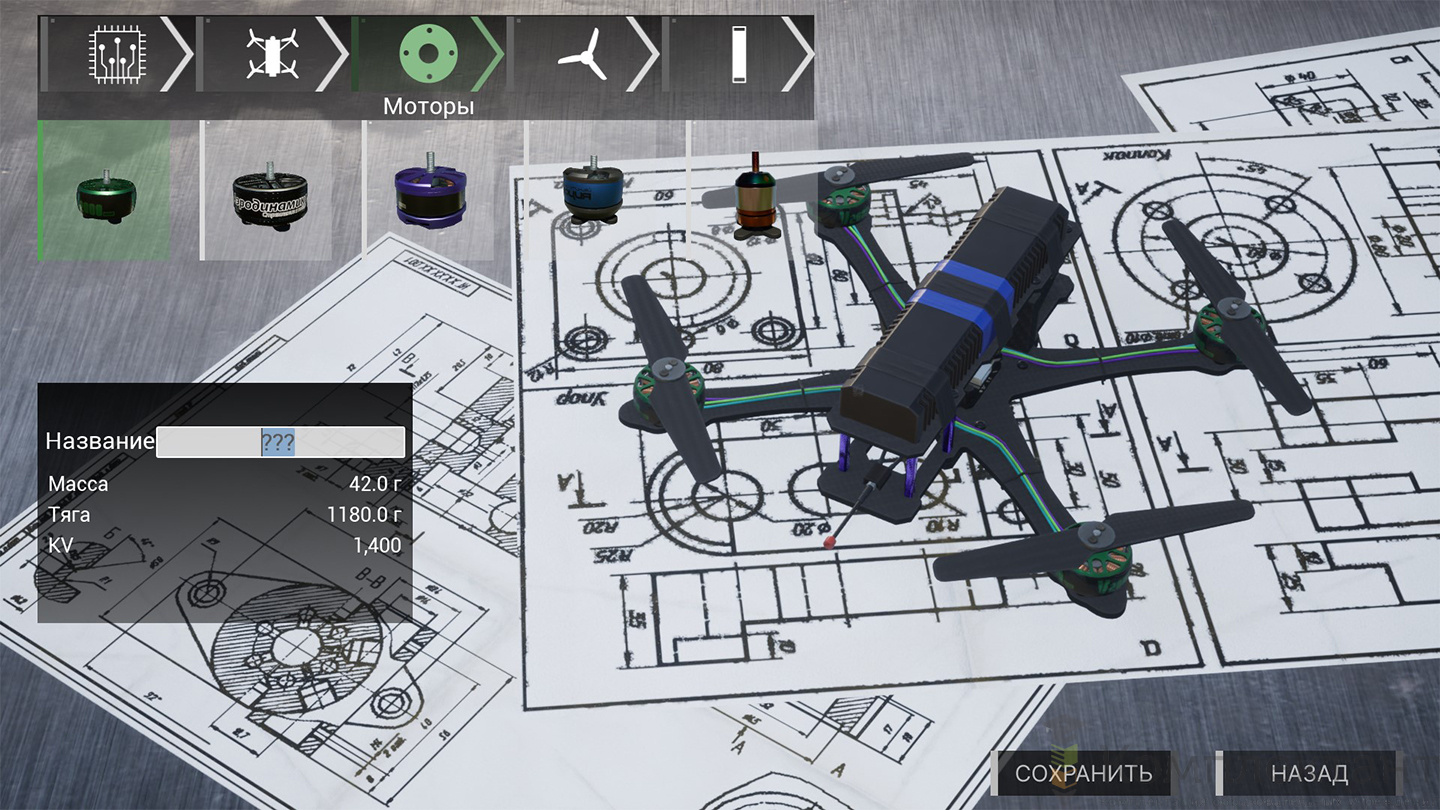 - Мастерская, состоящий из подраздела «Сборка дрона», знакомящего с последовательностью сборки и основными элементами дрона, и подраздела «Конструктор дрона» позволяющего выбирать готовые модели дронов, редактировать существующие или собирать новые и сохранять их