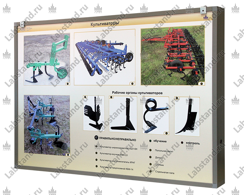 Назначение: Стенд-планшет предназначен для изучения принципа действия приборов и составных элементов культиваторов в учебном курсе «Почвообрабатывающие машины».