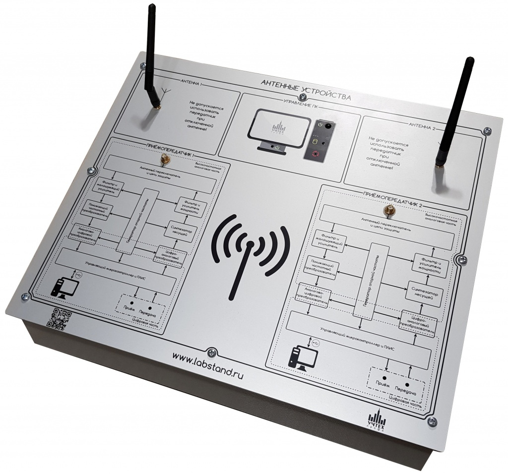 Стенд предназначен для проведения цикла лабораторных работ антенной тематики. В лабораторных работах исследуются особенности антенн различных диапазонов, а также влияние различных факторов, влияющих на эффективность работы приёмопередающих устройств. В стенде могут использоваться несколько антенн различных типов, в том числе спиральная, симметричный вибратор, волновой канал, а также логопериодическая антенна.