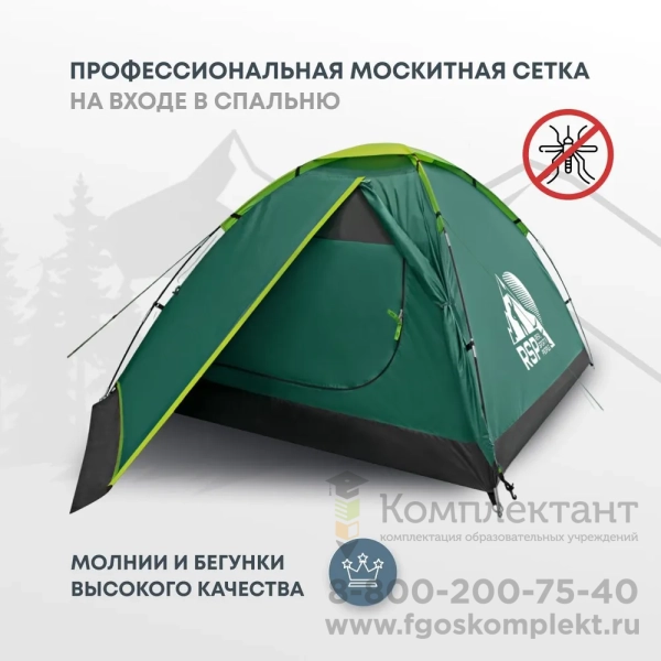 Тент палатки изготовлен из прочного и в то же время легкого материала Polyester 190T 63D с показателем водонепроницаемости 3000 мм. водного столба, что является очень высоким показателем и способен выдержать любой дождь. Тент палатки имеет пропитку задерживающую распространение огня. Дно палатки изготовлено из армированного полиэтилена – терпаулинга, который является очень крепким материалом показателем водонепроницаемости 10 000 мм. водного столба. Каркас палатки изготовлен из высококачественных фиберглассовых сборных дуг с металлическими наконечниками, они обладают хорошей гибкостью и большим запасом прочности.