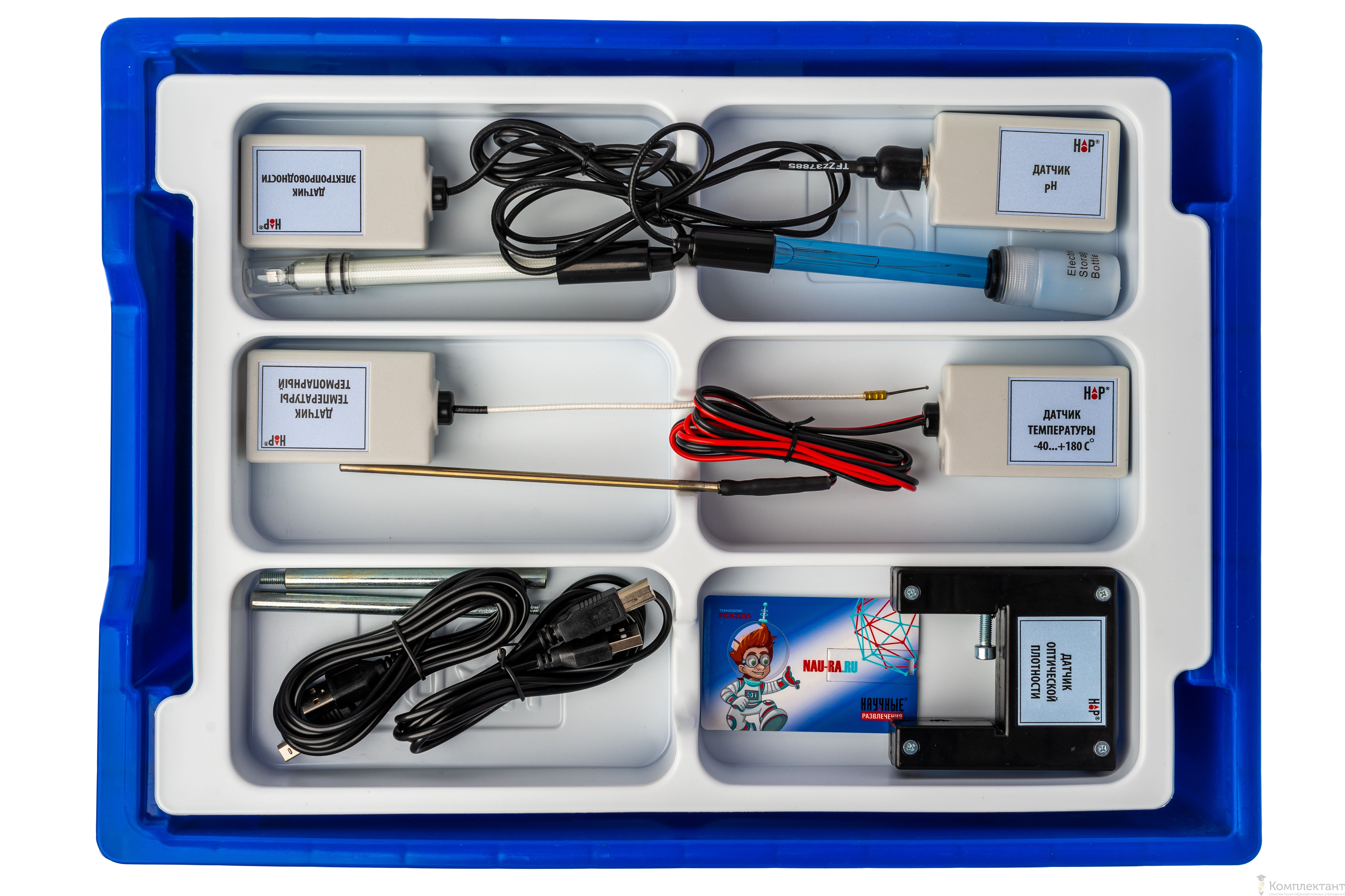 Цифровая лаборатория укомплектована в пластиковую систему хранения, которая закрывается прозрачной пластиковой крышкой на защелках для обеспечения наблюдения за содержимым. Комплект оборудования и датчики в системе хранения располагаются на ложементах.